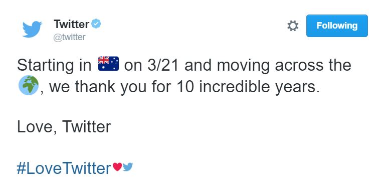 وأطلق “تويتر” هاشتاجًا “#LoveTwitter” للاحتفال بالعيد العاشر له، والذي احتل المركز الثالث بين قائمة الأعلى تداولًا، وخلال الهاشتاج أعرب المغردون عن حبهم لتويتر، وعن فائدته لهم، والعلافات والوظائف التي حصلوا عليها من خلاله.