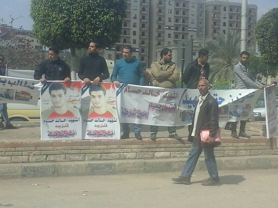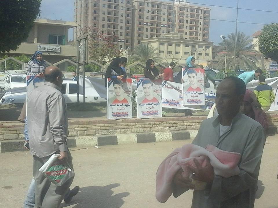 حمل الأهالي، اليوم، لافتات مكتوبًا عليها “نطالب بالقصاص”، “عايزين حق الشهيد”، “الشهيد خالد أبو دية قتل على يد أمين شرطة”.