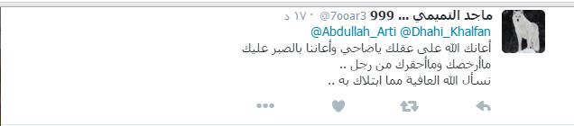وغرد ماجد التميمي بقوله : ” أعانك الله على عقلك ياضاحي وأعاننا بالصبر عليك، ماأرخصك وماأحقرك من رجل، نسأل الله العافية مما ابتلاك به”.