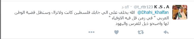 وقال حساب يحمل اسم K.S.Aبقوله : ” الله يخلف على الي جابك فلسطين كانت ولاتزال وستظل قضية الوطن العربي، في زمن قل فيه الاوفياء لها واصبحو ذيل للفرس واليهود”.