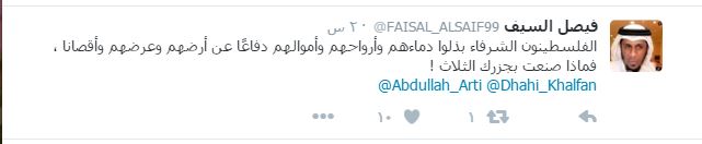 وقال فيصل السيف : “الفلسطينون الشرفاء بذلوا دماءهم وأرواحهم وأموالهم دفاعًا عن أرضهم وعرضهم وأقصانا ، فماذا صنعت بجزرك الثلاث !”.