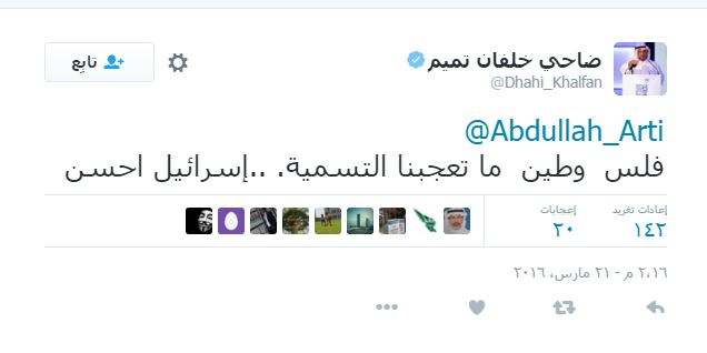 وكان خلفان قد قال في تغريدة على حسابه بموقع التدوين المصغر “تويتر”: “فلس وطين ما تعجبنا التسمية.. إسرائيل أحسن”.