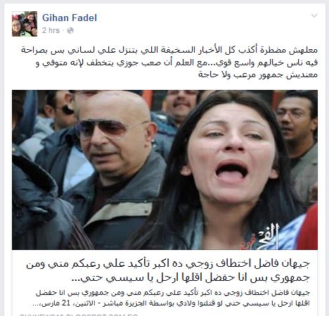 وقالت جيهان فاضل في تعليقها أنها مضطرة للرد على الأكاذيب التي تقال على لسانها، مؤكدة أن زوجها لم يتعرض للاختطاف، وذلك لأنه متوفى.