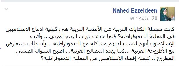 وقالت -عبر منشور لها على الـ”فيس بوك”-: “كانت معضلة الكتابات الغربية عن الأنظمة العربية هي كيفية إدماج الإسلاميين في العملية الديموقراطية؟”.
