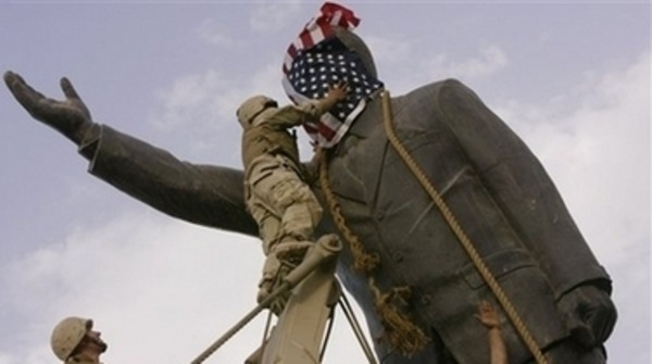 – في 9 أبريل 2003 أعلنت القوات الأميركية بسط سيطرتها على معظم المناطق ونقلت وكالات الأنباء مشاهد لحشد صغير يحاولون الأطاحة بتمثال للرئيس العراقي صدام حسين، في وسط ساحة أمام فندق الشيراتون، والتي قاموا بها بمساعدة من ناقلة دبابات أميركية وقام المارينز بوضع العلم الأميركي على وجه التمثال ليستبدلوا به علما عراقيا.