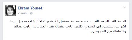 وأوضحت إكرام يوسف في تعليقها أنه “تم إخلاء سبيل محمود محمد، معتقل التيشيرت، بعد حبسه لأكثر من عامين على ذمة التحقيقات في مخالفة واضحة للقانون”.