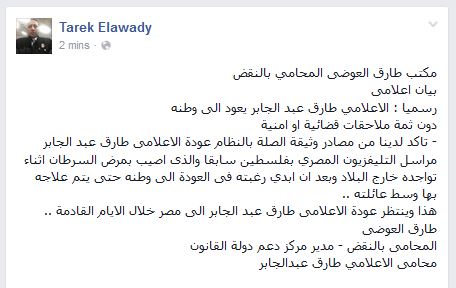 وقال العوضي في بيانه إنه تأكد بشكل رسمي من السماح لطارق عبدالجابر بالعودة إلى مصر، ومن المنتظر عودته إلى أرض الوطن خلال أيام معدودة.