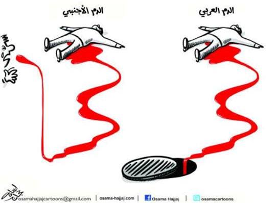 وعن موقف العالم من الدم العربي المهدر مقابل الدم الأجنبي، رسم أسامة الحاج هذا الكاريكاتير:
