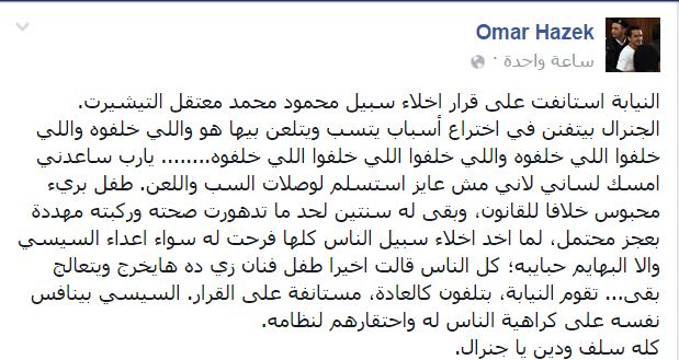 أعرب الناشط السياسي، عمر حاذق، عن دهشته من استئناف النيابة على قرار اخلاء سبيل محمود محمد معتقل التيشيرت، على الرغم من أنه طفل ويحتاج للخروج من أجل العلاج.