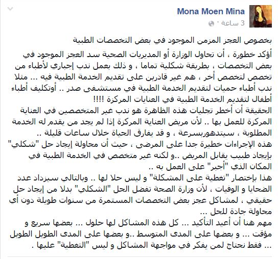 وأكدت “مينا: أن “أخطر تجليات هذه الظاهرة هو ندب غير المتخصصين في العناية المركزة للعمل بها .. لأن مريض العناية المركزة إذا لم يجد من يقدم له الخدمة المطلوبة، سيتدهور بسرعة، وقد يفارق الحياة خلال ساعات قليلة”.