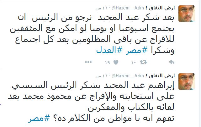 وقال -عبر تغريدات له على “تويتر”-: “إبراهيم عبد المجيد يشكر الرئيس السيسي، بحسب وصفه، على استجابته والإفراج عن محمود محمد بعد لقائه بالكتاب والمفكرين.. تفهم إيه يا مواطن من الكلام ده؟”.