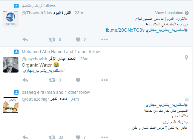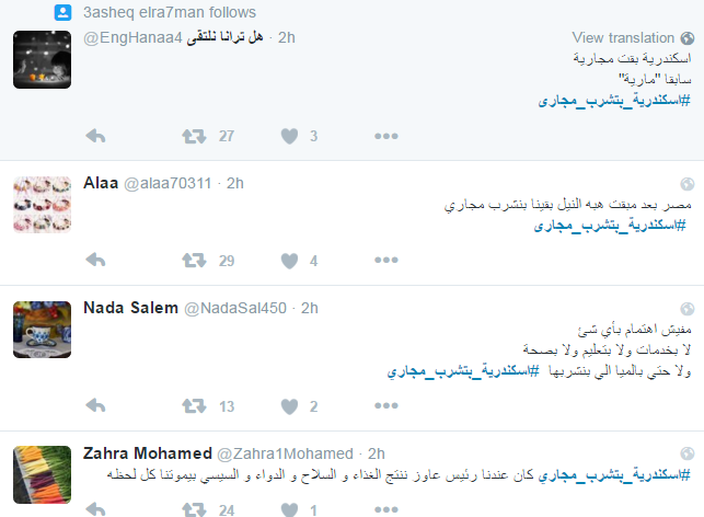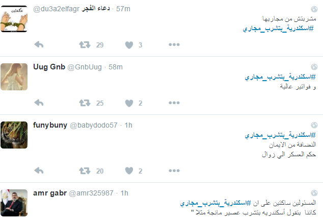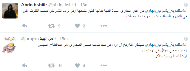 ونشروا صورًا أثارت استياءهم لتلوث مياه الشرب واختلاطها بمياه الصرف الصحي بعدد كبير من المناطق داخل محافظة الإسكندرية، واحتل هذا الهاشتاج الصدارة والأكثر تداولاً على مستوى مصر عبر موقع “تويتر”.