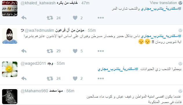 تصدر هاشتاج “إسكندرية بتشرب مجاري” موقع التدوين المصغر “تويتر”، حيث عبر فيه المغردون من أهالي الإسكندرية عن مأساتهم ومعاناتهم من سوء الخدمات والتي منها مياه الشرب.