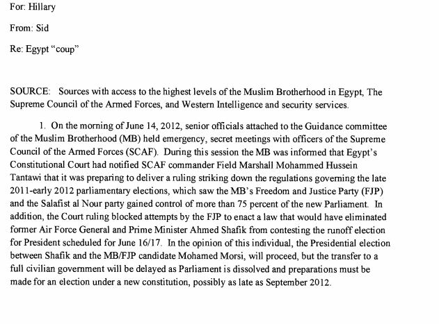 مصدر الوثيقة صاحب الاسم الحركي يدعى ““SID تكرر ذكره في عدة وثائق، ودائمًا ما يوصف بأنه لديه القدرة على الوصول إلى أعلى المستويات في “الإخوان المسلمين” وحزب “الحرية والعدالة” والمجلس الأعلى للقوات المسلحة والأجهزة الأمنية والمخابراتية الغربية، والوثيقة موجهة إلى وزيرة الخارجية الأميركية بتاريخ 14 يونيو 2012؛ حيث جاءت الوثيقة تحت عنوان “انقلاب” مصر.