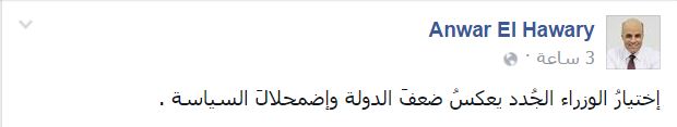 انتقد الكاتب الصحفي، أنور الهواري، معايير اختيار الوزراء الجدد، في التعديل الوزاري الأخير؛ حيث قال، في منشور له على حسابه بموقع “فيس بوك”: “اختيارُ الوزراء الجُدد يعكسُ ضعفَ الدولة وإضمحلالَ السياسة”.