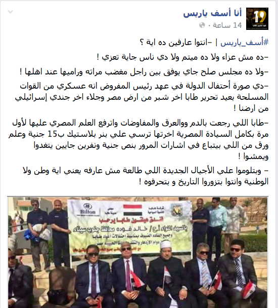 وقال “صبري” في بلاغه، إن تطاول كريم حسين، أدمن صفحة “إحنا آسفين يا ريس” المؤيدة للرئيس المخلوع حسني مبارك، على “السيسي”، بسبب تصريحاته خلال لقائه بالمثقفين، والتي قال فيها إن “مبارك هو اللي جاب البلد على الأرض”.