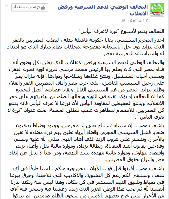قال التحالف في بيان عبر صفحته على موقع التواصل الاجتماعي “فيس بوك” مساء أمس الخميس: “يا كل القوي الحرة بمصر، الوقت يحتاج لشراكة تنحاز للإرادة الشعبية المنتفضة ومطالب ثورة ينايرالمجيدة، لننقذ حاضر مصر، ونحمي مستقبل المصريين”.