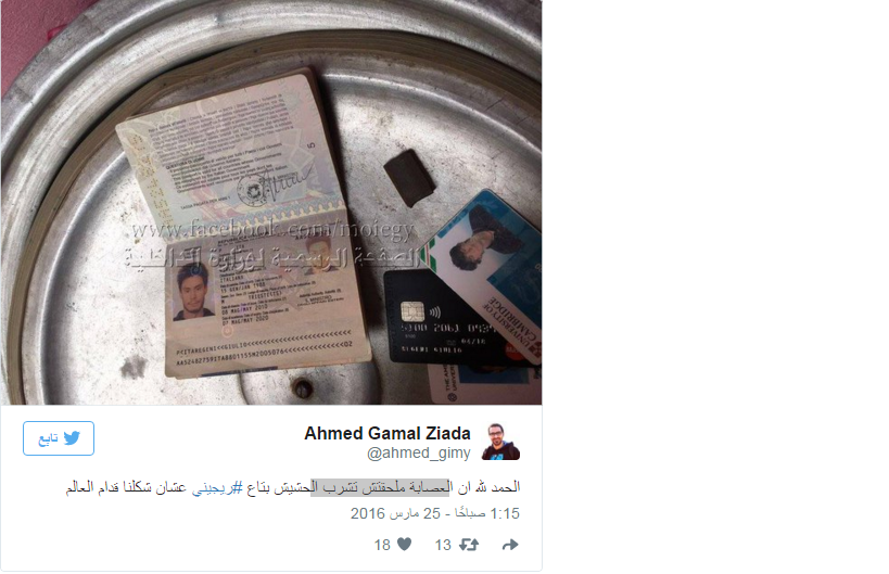 تضمنت المتعلقات التي عرضتها وزارة الداخلية المصرية جواز سفره وهاتفه الشخصي وبطاقات جامعية ونظارات شمسية وحقيبة نقود نسائية، وقطعة حشيش داخل حقيبة ريجيني.
