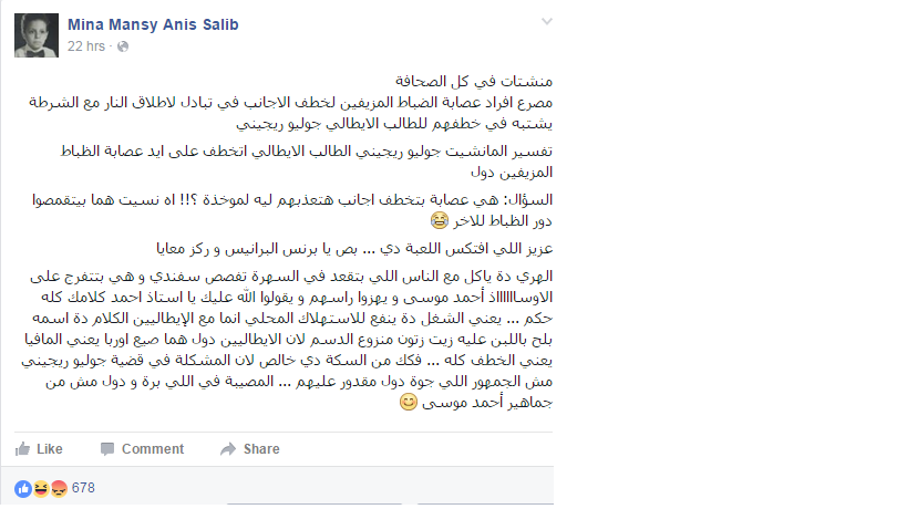 – الناشط مينا منسي :” منشتات في كل الصحافة تؤكد مصرع أفراد عصابة الضباط المزيفين لخطف الأجانب في تبادل لإطلاق النار مع الشرطة يشتبه في خطفهم للطالب الإيطالي جوليو ريجيني”.
