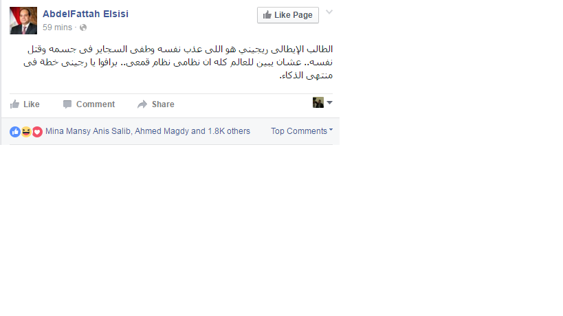 – حساب يحمل أسم عبد الفتاح السيسي: أن الطالب الإيطالى ريجيني هو اللى عذب نفسه وطفى السجاير فى جسمه وقتل نفسه.. عشان يبين للعالم كله أن نظامي نظام قمعي.. برافو يا رجيني خطة في منتهى الذكاء.