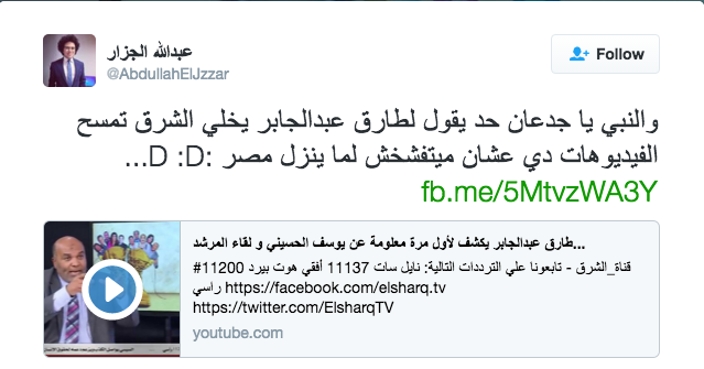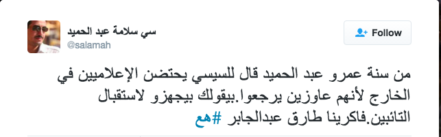 وقال الإعلامي بقناة الجزيرة “زين العابدين توفيق” ، كإعلامي مصري مقيم في الخارج لست نادمًا على اي كلمة قلتها ضد ظلم وغباء النظام ، مضيفًا :”لست راغبًا في العودة الى مصر ما بقي فيها هذا النظام الظالم، ولا مانع لدي أن أدفن في أي أرض تغدق بالعدل والكرامة على من يخطو عليها”.