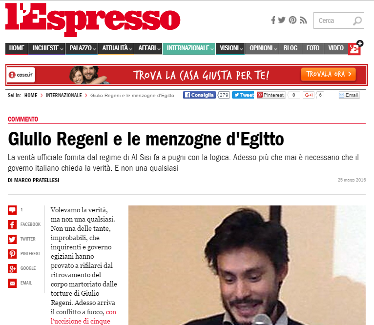 أكدت صحيفة “لسبريسو” الإيطالية أن بيان حكومة السيسي، الذي صدر أمس الخميس، بشأن مقتل الطالب الإيطالي جوليو ريجيني؛ يمثل كذبة تخالف المنطق.