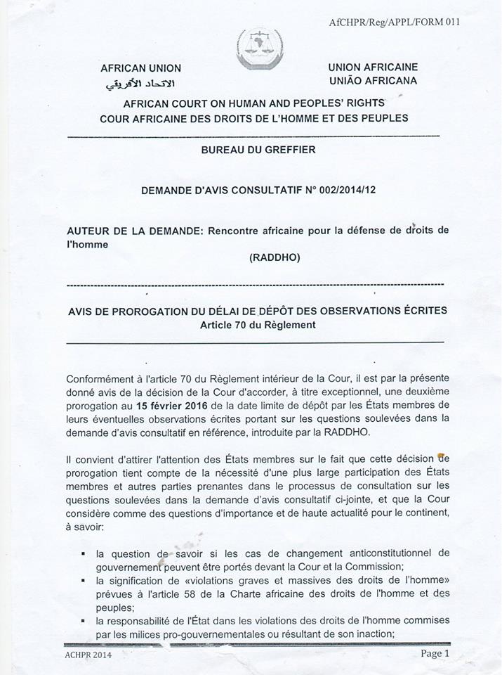 “طبقا للمادة رقم 70 الخاصة باللوائح الداخلية للمحكمة، فقد قررت المحكمة بطريقة استثنائية إعطاء فترة تأجيل ثانية حتى يوم 15 من فبراير لعام 2016م، واعتبار هذا التاريخ يومًا نهائيًا لتسلم ردود مكتوبة من أعضاء الحكومة على النقاط محل التقاضي”.