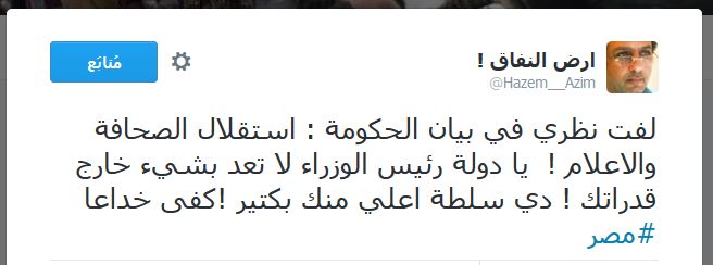 وقال عبدالعظيم في تغريدته إن شريف إسماعيل وعد باستقلال الصحافة وحرية الإعلام، وهو لا يملك صلاحيات لتنفيذ تلك الوعود، مضيفا: “لا تعد بشيء خارج قدراتك”.