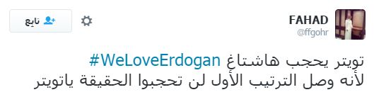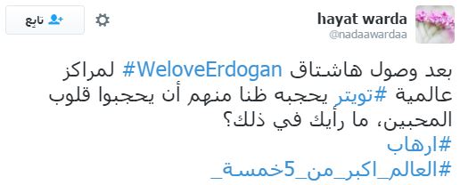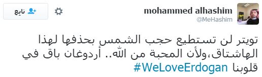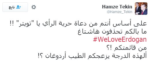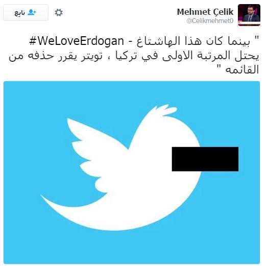حذفت إدارة موقع التواصل الاجتماعي “تويتر” هاشتاج “WeLoveErdogan” (نحن نحب أردوغان) بعد حصوله على الترتيب الأول في الأكثر تداولا على الموقع، بمشاركة أكثر من نصف مليون تغريدة.