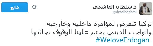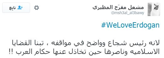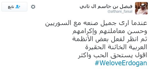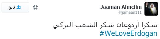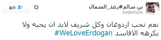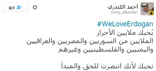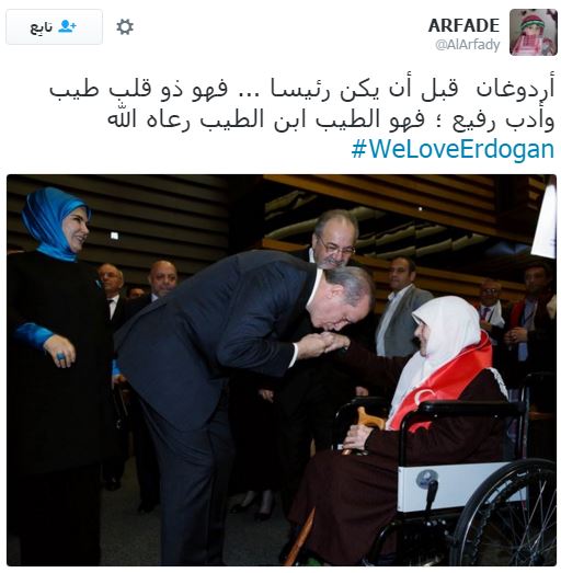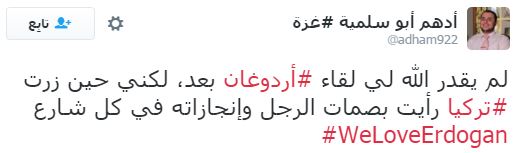 وأشاد أكثر المغردين بالدور التركي في قضايا الأمة العربية والإسلامية، خاصة دور الرئيس التركي مع اللاجئين السوريين، ومحاولاته لإنقاذ العراق، كما تمنى بعضهم أن يصبح الرؤساء العرب مثل أردوغان في فكره ونهضته.