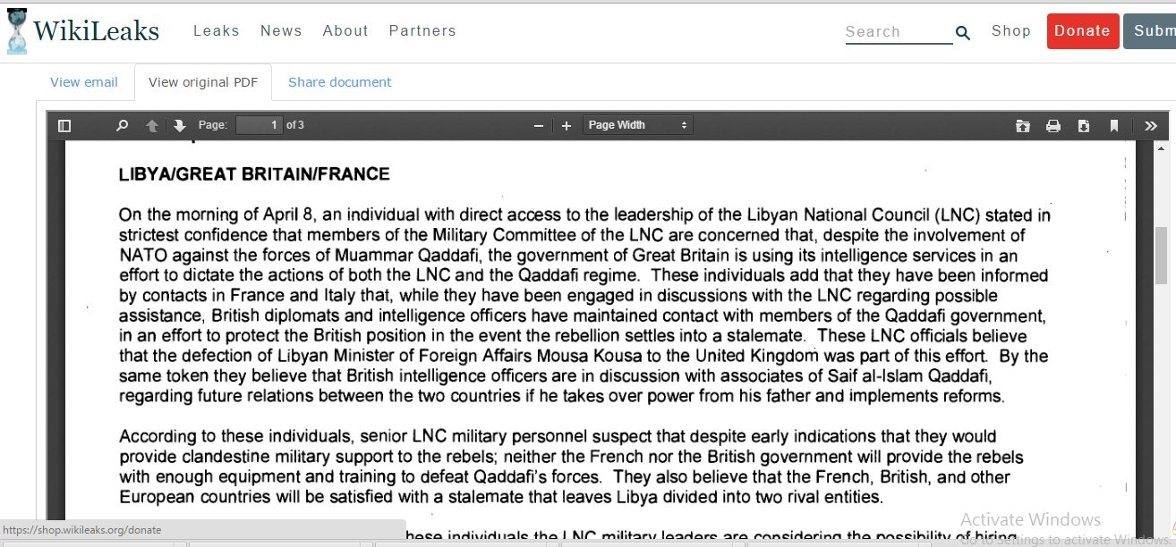 قالت الوثيقة: على الرغم من أن الناتو اتخذ قرار التدخل في ليبيا، فإن الحكومة البريطانية تستخدم استخباراتها في مسعى لتملي ما سيتم فعله على كل من القذافي، والمجلس الوطني الليبي، وبينما تتواصل إيطاليا وفرنسا مع المجلس الوطني الليبي بشأن المساعدة الممكنة فإن بريطانيا قامت بعمل اتصالات مع أعضاء في حكومة القذافي من أجل حماية الموقف البريطاني في حال وقوع المتمردين في مأزق، وتعتقد هذه المصادر بأن انشقاق وزير الخارجية الليببي “موسى كوسه” إلى المملكة المتحدة جزء من هذه الجهود، كما يعتقدون أن ضباط المخابرات البريطانية في نقاش مع مساعدي سيف الإسلام القذافي فيما يتعلق بمستقبل العلاقة بين البلدين في حال وصوله إلى السلطة وتنفيذ إصلاحات.
