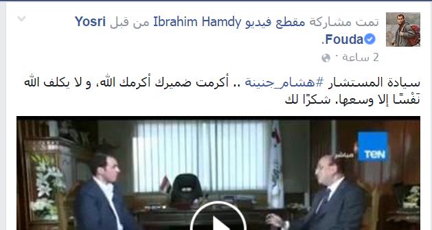 توجه الإعلامي يسري فودة، برسالة إلى المستشار هشام جنينة بعد إقالته من منصب رئاسة الجهاز المركزي للمحاسبات، قائلا: “شكرا لك”، مضيفا عبر منشور له على “فيس بوك”: “سيادة المستشار هشام جنينة .. أكرمت ضميرك أكرمك الله، و لا يكلف الله نَفْسًا إلا وسعها. شكرًا لك”.