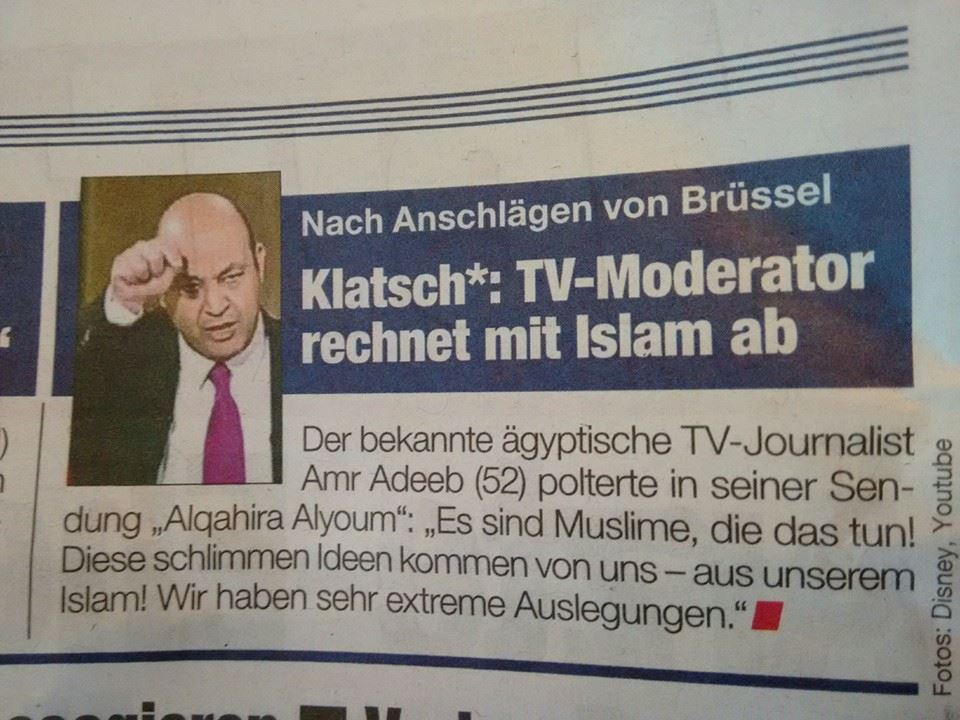 نشرت جريدة “هويتي” النمساوية، المعروفة بهجومها المتواصل على الإسلام، تصريحات عمرو أديب، عبر قناة “القاهرة اليوم” التي تحمل المسلمين مسؤولية الهجمات الإرهابية على مستوى العالم، وذلك عقب تفجيرات بروكسل.