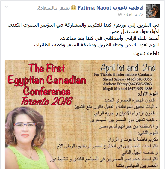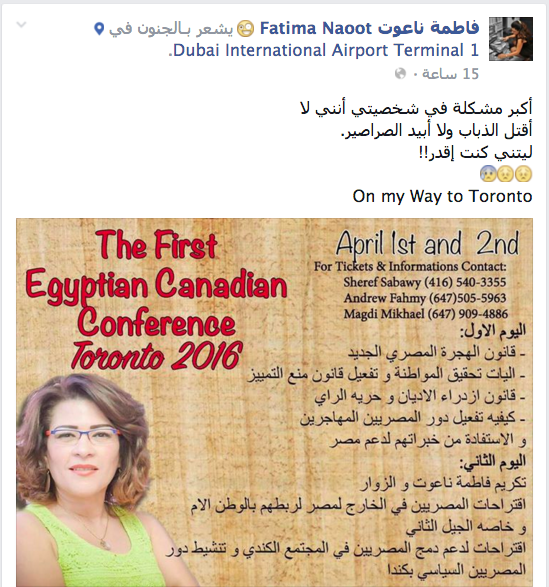 وكانت قد كتبت -على صفحتها على “فيس بوك”-: “في الطريق إلى تورونتو-كندا للتكريم والمشاركة في المؤتمر المصري الكندي الأول حول مستقبل مصر. أسعد بلقاء قرائي وأصدقائي في كندا بعد ساعات. اللهم نعوذ بك من وعثاء الطريق ومشقة السفر وخطف الطائرات”.