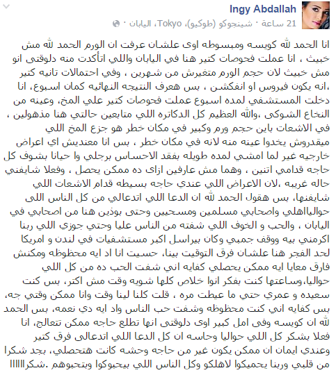 وأكدت إنجي -عبر حسابها الرسمي على “فيس بوك”- أنه بعد إجرائها للعديد من الفحوصات في اليابان، تبيّن أن الورم المصابة به حميد وليس خبيثًا، قائلة في بيانها: “أنا الحمد لله كويسة ومبسوطة أوي علشان عرفت إن الورم الحمد لله مش خبيث، أنا عملت فحوصات كتير هنا في اليابان واللي اتأكدت منه دلوقتي إنه مش خبيث لأن حجم الورم متغيرش من شهرين، وفي احتمالات تانية كتير إنه يكون فيروس أو إنفكشن، بس هعرف النتيجة النهائية كمان أسبوع”.