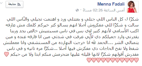 وفي سياق آخر، توجهت الفنانة منة فضالي بالشكر لمتابعيها وجمهورها الذين اهتموا بخبر نقلها إلى المستشفى وتردي وضعها الصحي؛ حيث تبين أنها توجهت إلى المستشفى بسبب إصابتها بكيس دهني وضرورة إجراء عملية جراحية لإزالته.