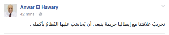 طالب الكاتب الصحفي، أنور الهواري، بمحاكمة النظام الحالي؛ بعد حادث مقتل الطالب الإيطالي جوليو ريجيني.