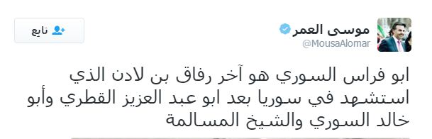 – الإعلامي السوري موسى العمر: أبو فراس السوري هو آخر رفاق بن لادن الذي استشهد في سوريا بعد أبو عبد العزيز القطري وأبو خالد السوري والشيخ المسالمة.