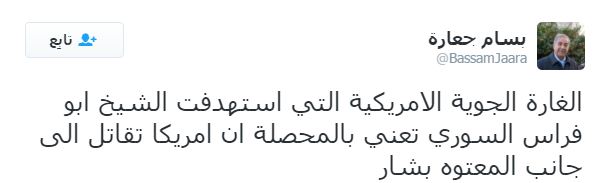 – المعارض السوري بسام جعارة: الغارة الجوية الأميركية التي استهدفت الشيخ أبو فراس السوري تعني بالمحصلة أن أميركا تقاتل إلى جانب المعتوه بشار.
