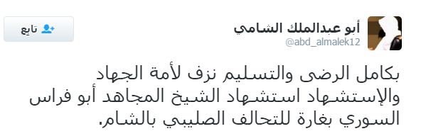 – أبو عبدالملك الشامي: بكامل الرضى والتسليم نزفُّ لأمة الجهاد والاستشهاد استشهاد الشيخ المجاهد أبو فراس السوري بغارة للتحالف الصليبي بالشام.