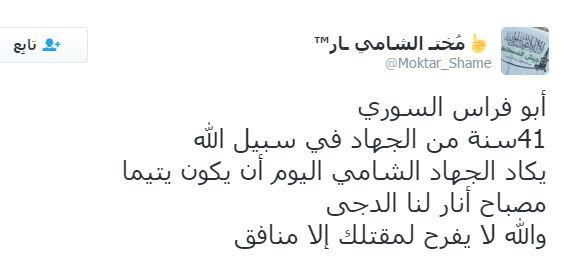 – مُختار الشامي: 41 سنة من الجهاد في سبيل الله يكاد الجهاد الشامي اليوم أن يكون يتيما، مصباح أنار لنا الدجى، والله لا يفرح لمقتلك إلا منافق.