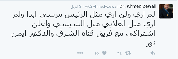 نفى شريف فؤاد، المستشار الإعلامي للعالم المصري الدكتور أحمد زويل، التصريحات التي تم تداولها على لسان الدكتور زويل عبر “تويتر”، والتي قال فيها: إنه لم ير مثيلا للرئيس الشرعي محمد مرسي ولم ير مثل السيسي الانقلابي، معلنا انضمامه لفريق قناة “الشرق”.