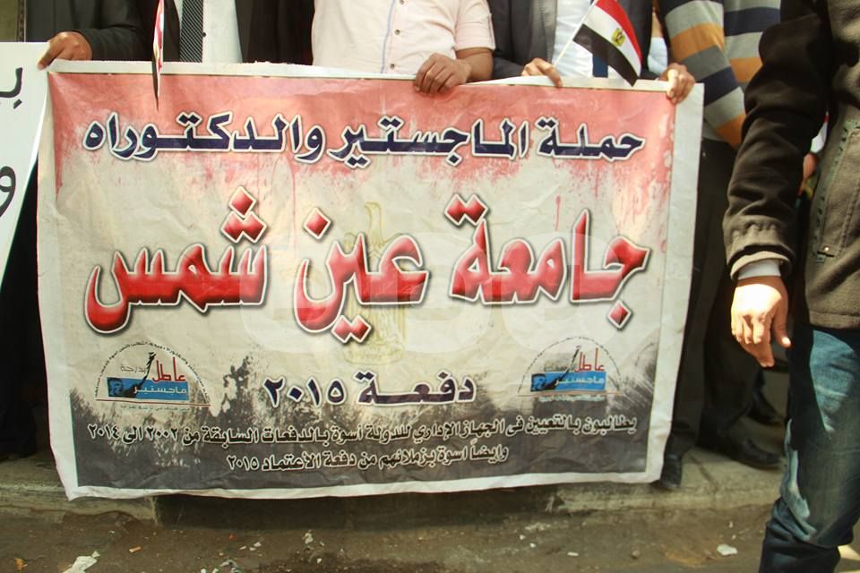 نظم اليوم حملة الماجستير والدكتوراه دفعة 2015 بجامعة عين شمس وقفة احتجاجية أمام مجس الوزراء؛ للمطالبة بتعيينهم في الجهاز الإداري بالدولة أسوة بالدفعات السابقة.