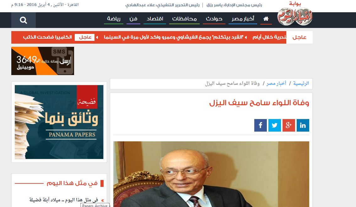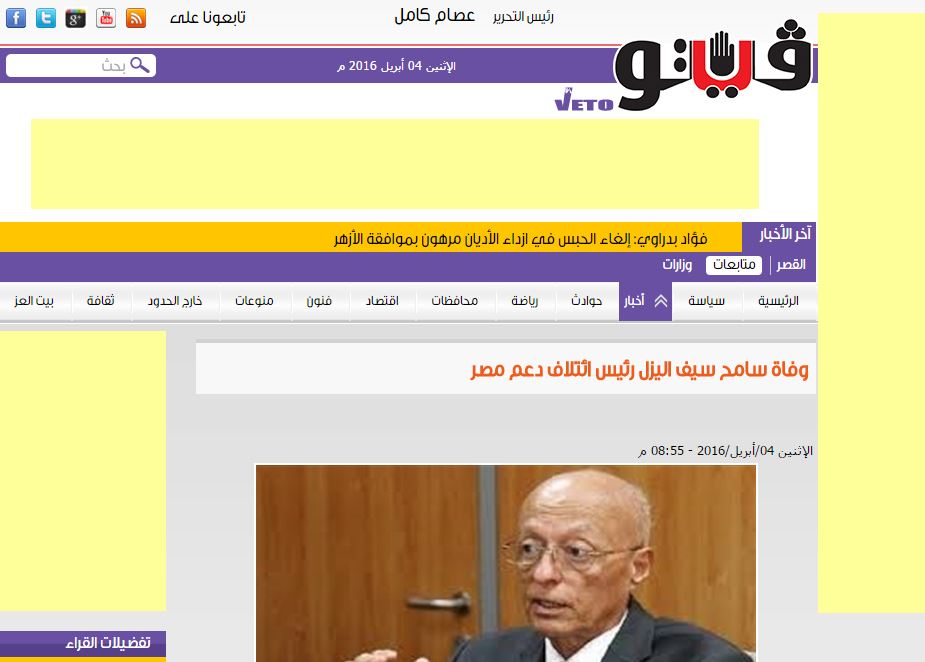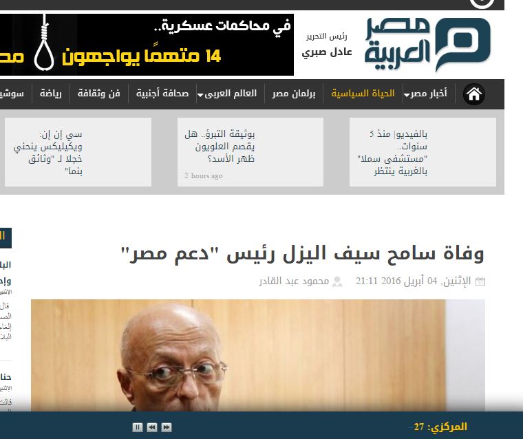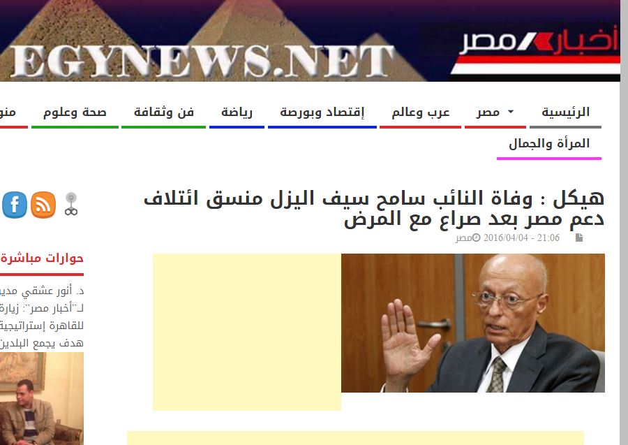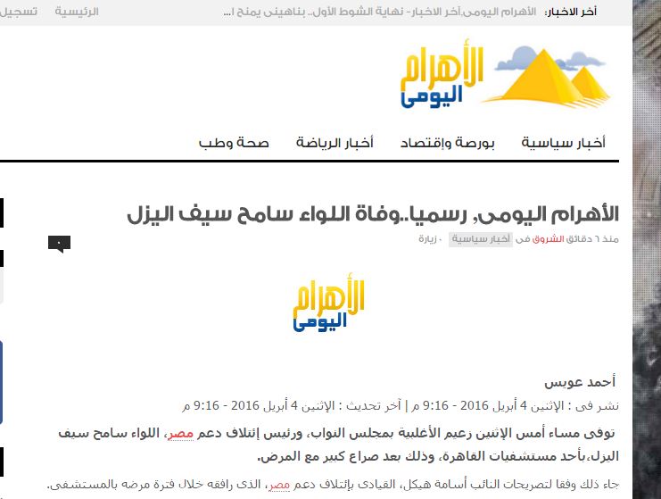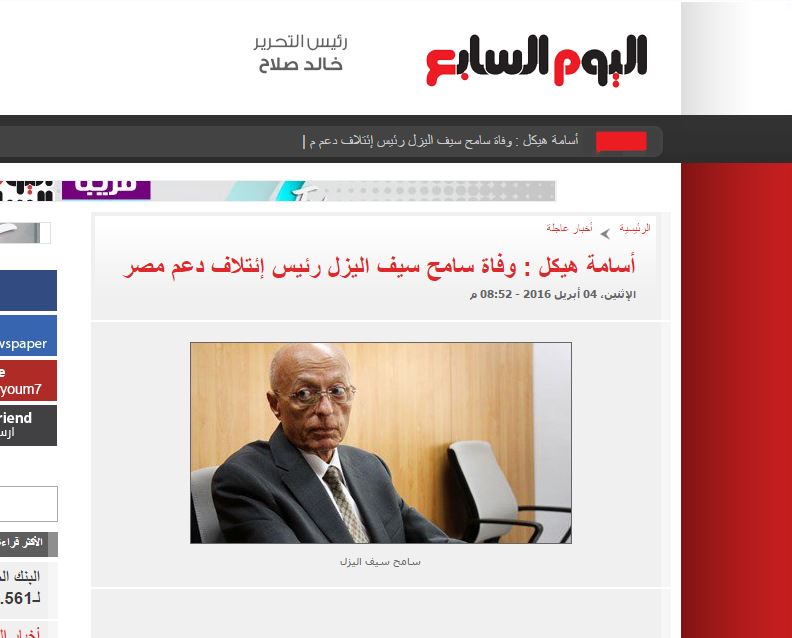 وفي ما يلي رصد لأبرز مانشتات الصحف والمواقع الإخبارية المصرية التي تناولت وفاة اللواء سامح سيف اليزل رئيس ائتلاف دعم مصر.