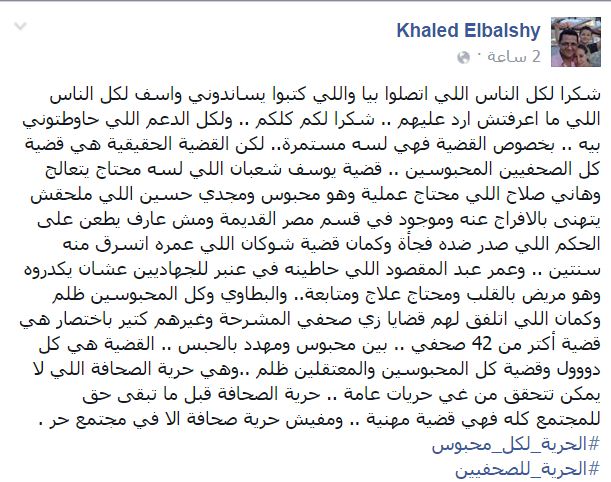 وأضاف “البلشي” أن قضيته ما زالت مستمرة، بينما القضية الحقيقية “هي قضية كل الصحفيين المحبوسين، قضية يوسف شعبان اللي لسه محتاج يتعالج، وهاني صلاح اللي محتاج عملية وهو محبوس، ومجدي حسين اللي ملحقش يتهنى بالإفراج عنه وموجود في قسم مصر القديمة ومش عارف يطعن على الحكم اللي صدر ضده فجأة وكمان قضية شوكان اللي عمره اتسرق منه سنتين، وعمر عبدالمقصود اللي حاطينه في عنبر للجهاديين عشان يكدروه وهو مريض بالقلب ومحتاج علاج ومتابعة”.