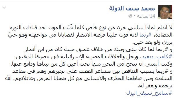 ودعا “سيف الدولة” -في نهاية منشوره- لـ”سيف اليزل” بالرحمة والمغفرة.