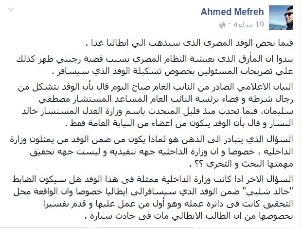 وقال “مفرح” -عبر منشور له على “فيس بوك”-: “يبدو أن المأزق الذي يعيشه النظام المصري بسبب قضية ريجيني ظهر كذلك على تصريحات المسؤولين بخصوص تشكيلة الوفد الذي سيسافر.”