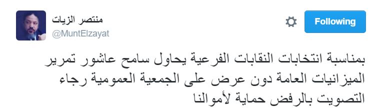 وقال -عبر تغريدة له على “تويتر”-: “بمناسبة انتخابات النقابات الفرعية، يحاول سامح عاشور تمرير الميزانيات العامة دون عرض على الجمعية العمومية وجاء التصويت بالرفض حماية لأموالنا”.