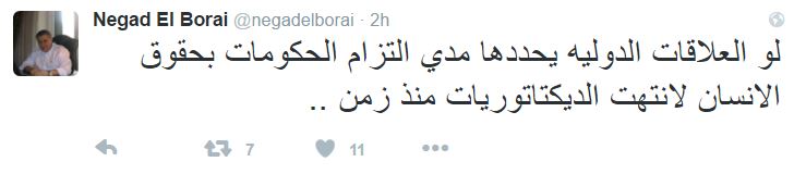 وأضاف “البرعي” -عبر تغريدة أخرى- “لو العلاقات الدولية يحددها مدى التزام الحكومات بحقوق الإنسان لانتهت الديكتاتوريات منذ زمن”.