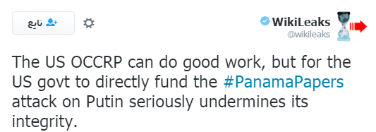 وأكد “ويكيليكس” في تغريدة أخرى، أن مشروع “أوراق بنما” تلقى تمويلًا مباشرًا من الحكومة الأميركية.